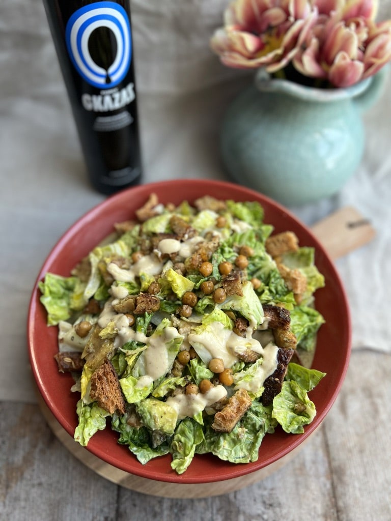 Eenpans caesar salad met knapperige kikkererwten, avocado en plantaardige kip